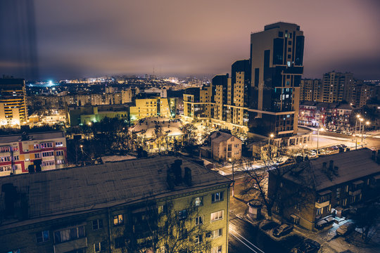 Aerial view at downtown of night city Belgorod, Russia, evening dramatic winter cityscape