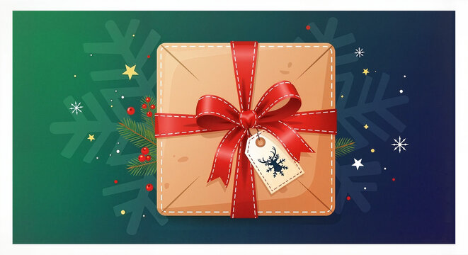 Gift box with red ribbon and tag on festive winter background