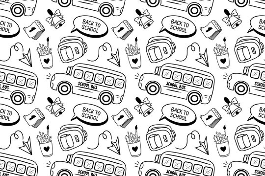 Seamless pattern school bus transport, backpack, school bell background. Doodle sketch style vector pattern. Perfect for textile, wrapping paper, greeting cards and posters for kindergarten.