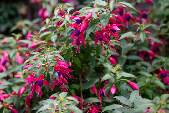 Long Shot of Fuchsia Flowers on Shrub in Garden