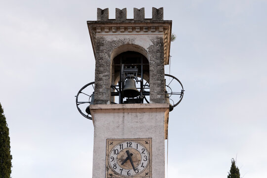 Bell tower of the church in Tremosine on Lake Garda with the church clock at half past seven o'clock