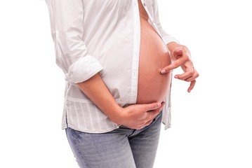 Pregnant woman touching her belly button with your finger.