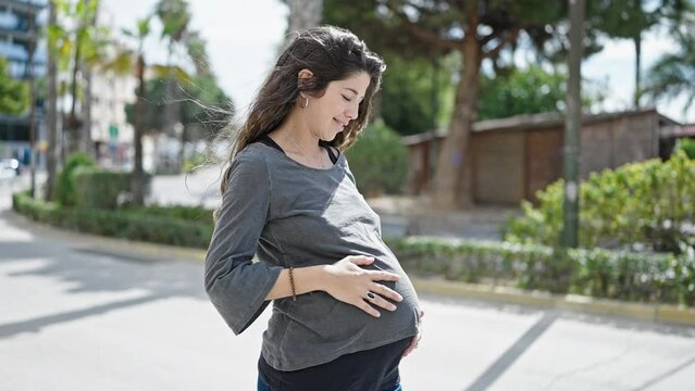 Future parenthood concept where handsome smiling loving man tenderly touching the pregnant tummy of his pretty happy cheerful wife