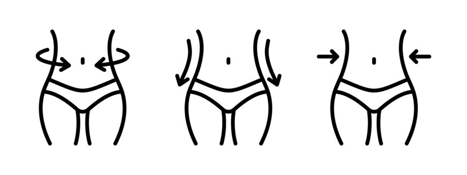 Weight loss icon set. Slimming woman vector illustration. Weight control symbol. Healthy nourishment and fitness pictogram. Waistline measurement sign. Belly loss icon.