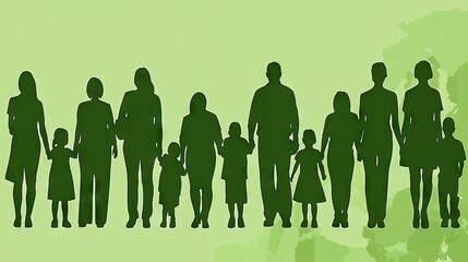 Large family silhouette holding hands, green background, unity, togetherness, family values