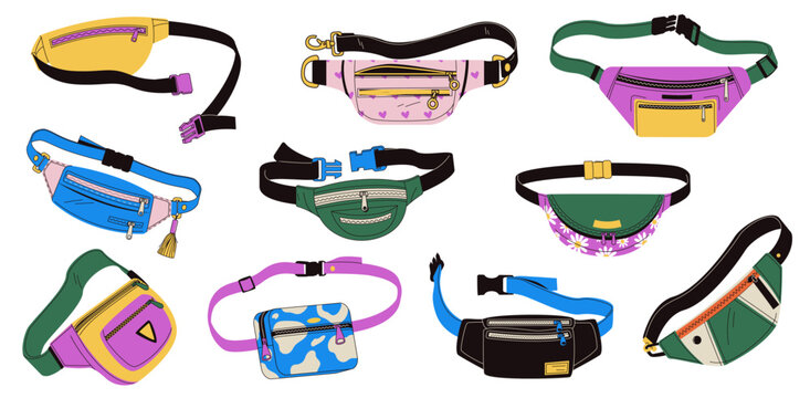 Waist bag. Doodle handbag with various pockets and accessories, fashion nylon purse with belt buckle, stylish summer accessory. Vector set