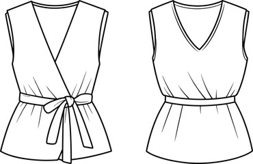 Fashion flat vector of sleeveless women’s wrap top and V-neck belted blouse, detailed technical sketch with waist tie design