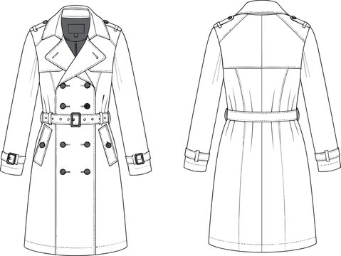 Trench coat technical fashion sketch, front and back view, double-breasted design, belted waist, epaulets, garment construction vector template