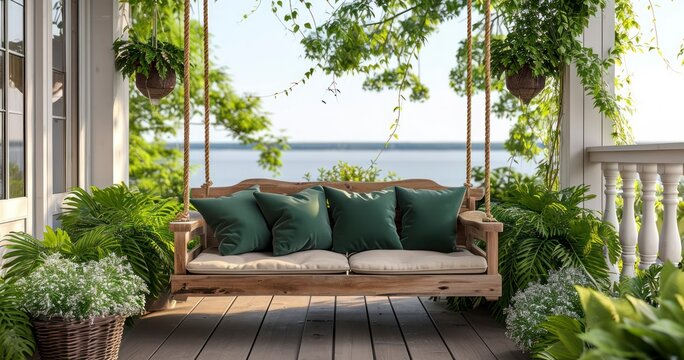 Comfortable wooden swing bench with soft cushions, set in a lush green garden