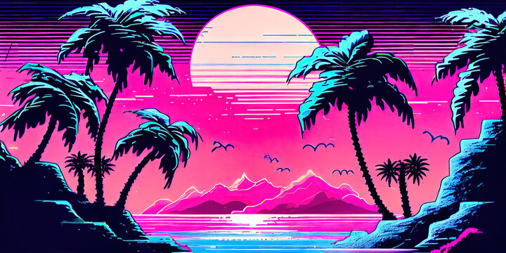 AI Generated. AI Generative. Old vintage cyberpunk vapor wave synthwave miami vice florida tropical landscape. Graphic Art