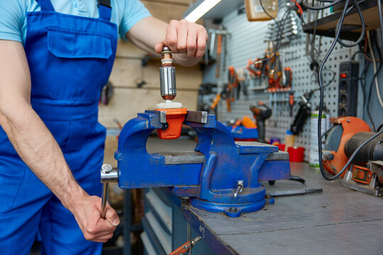 Woodworker using bench vise to hold lumber block, starting furniture assembling in workshop, close up shot. Craftsperson in joinery using vice tool to clamp piece of wood before carving it