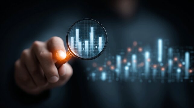 A hand holding a magnifying glass, zooming in on a specific point on a bar graph, focus on meeting or exceeding benchmarks