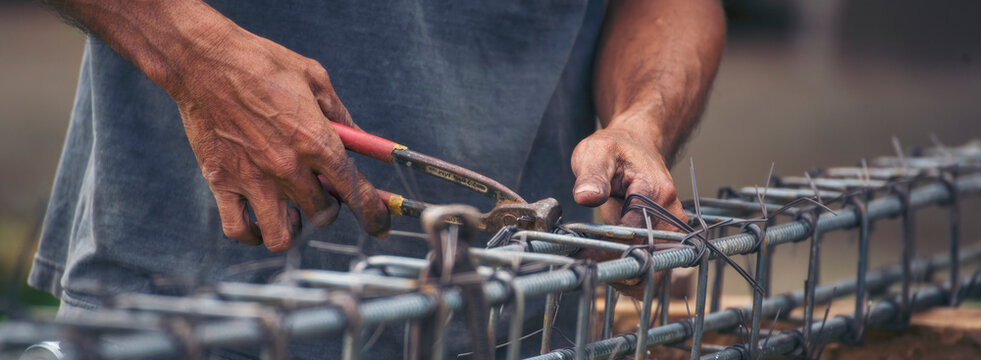 Banner Construction Worker hands using pincer pliers iron wire. Outdoor Worker using wire bending pliers. Banner Men hands bending cutting steel wire fences bar concrete worker with copy space