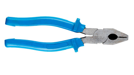 Old pliers with rubber grips in blue on a white background. Top view. Repair or building concept.
