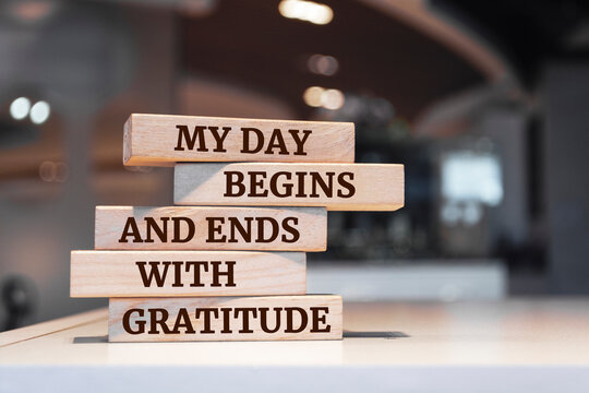 Wooden blocks with words 'My Day Begins and Ends with Gratitude'.
