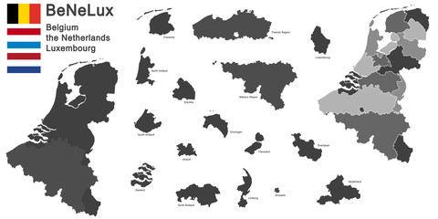 Vector illustration set with isolated silhouettes of Benelux Union maps (simplified shapes). National flags of Belgium, Netherlands, Luxembourg. White background and names of countries