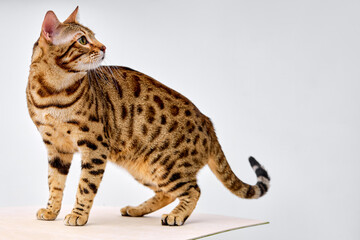 Bengal Cat walking on White studio background, beautiful color of wool. purebred bengal cat looking at side, calm and serious, scared frightened. portrait copy space for advertisement