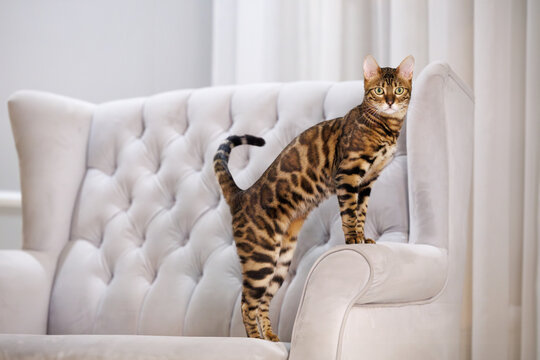 Young bengal cat is sleeping on the bed. Close-up photo. Selective focus. Banner format. Copy space.