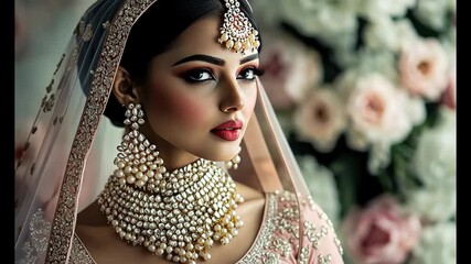 Indian/Bangladeshi/Pakistani bride in traditional white wedding saree white jewelry, stands humbly by the wedding hall, with intricate jewelry and makeup, showcasing her stunning beauty and cultural e