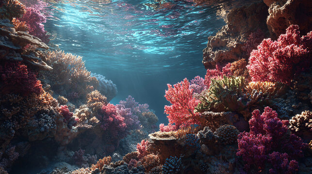 A vibrant coral reef ecosystem teeming with life beneath the ocean surface