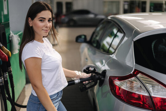 Unknown Caucasian woman driver businesswoman female car buyer girl lady refuel automobile tank auto vehicle fuel nozzle in city gas station ecology diesel price problem oil benzine gasoline transport
