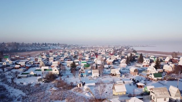 4k aerial photography. Winter landscape on the village. Warm sunset light.