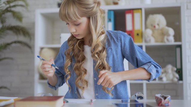 Cute girl draws with colored felt-tip pens. girl chooses pen color 4K