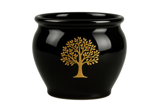 Black cremation urn with gold tree of life symbol representing remembrance, eternal life, and memorial on transparent background