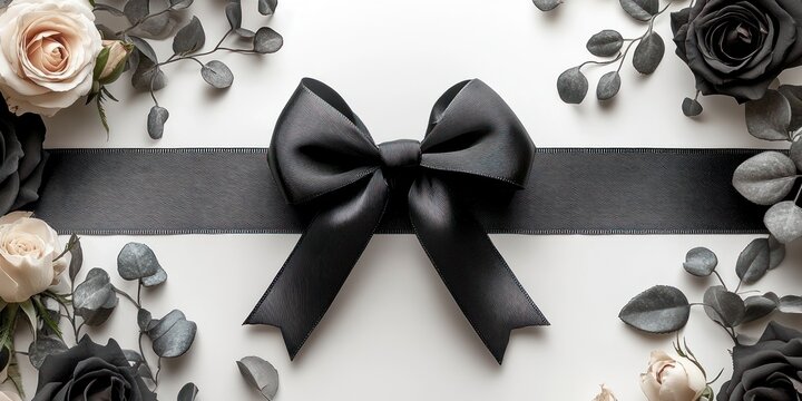 Coffin with white flowers for funeral service, space on the left for text, memorial template, eulogy card