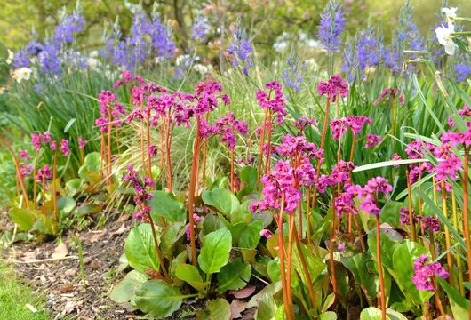 beautiful flower bed of pink bergenia cordifolia blooming with other blue melody flowers  in a spring garden