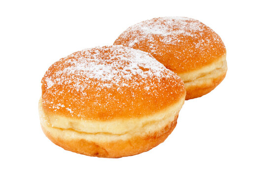 German fried donut, so called Krapfen, Berliner or Pfannkuchen, filled with rose hip jam and dusted with cinnamon sugar, traditionally eaten at carnival and at New Year's Eve on white background