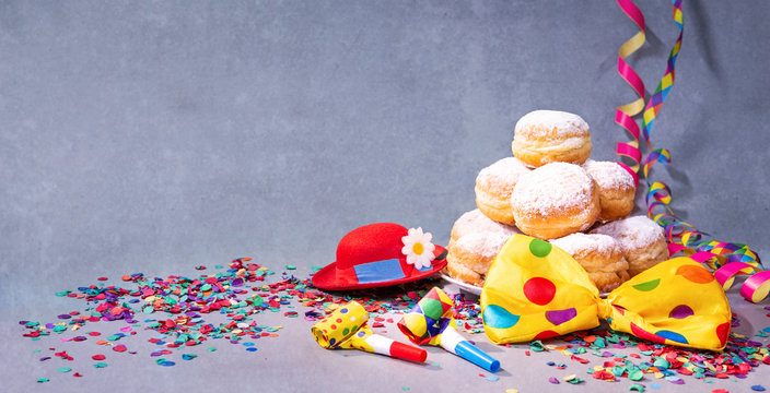 Carnival powdered sugar raised donuts with paper streamers. German berliner or krapfen for carnival
