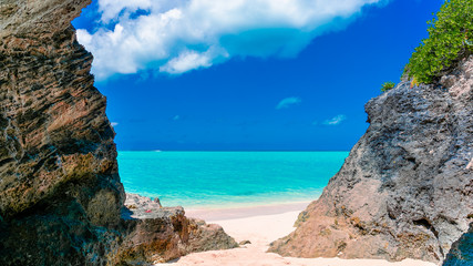 Beautiful pink sand beach with turquoise water and rocky cliffs in bermuda