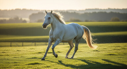 white horse running in the field