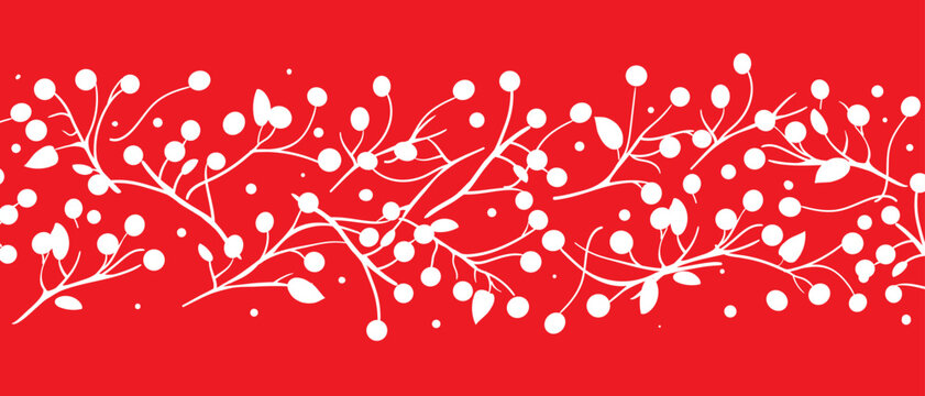 Christmas berry horizontal banner, red background. Holly, pine twigs, red berries. Winter nature design, vector illustration