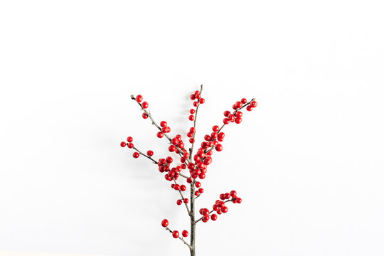 Minimal seasonal composition. Pattern of branch with red berries on isolated white background. Christmas holidays, winter concept. Header, copy space.