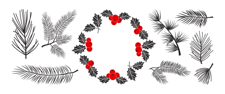 Christmas mistletoe wreath, winter fir branch and pine sprig, holly leaf and ilex berry. Floral holiday twig isolated on white background. Sketch evergreen plant, foliage decor. Vector illustration