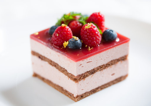 Berry Mousse Cake with Fresh Garnish on Elegant Setting. Sumptuous berry mousse cake topped with fresh berries on pastel backdrop.