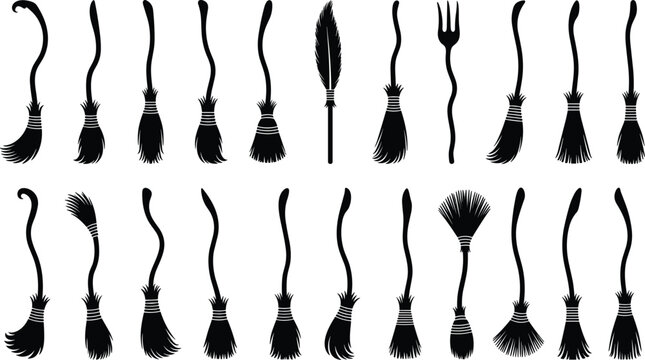 Halloween witch broomstick silhouette collection, magic flying besom black icons set, spooky sorcery tools vector illustration, fantasy wizard accessories design elements.