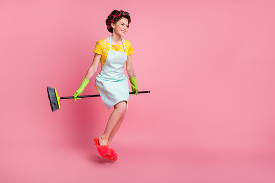 Full length body size view of attractive cheerful maid sitting besom having fun flying isolated on pink pastel color background