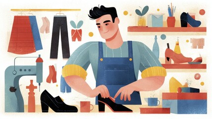 Skilled shoemaker crafting shoes in workshop surrounded by tools and materials