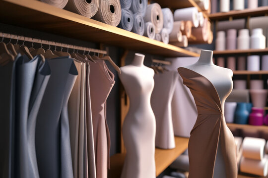 Fabric shop and sewing studio, mannequin dressed in elegant, exclusive dress. Scene of tailoring, with rolls of fabric, sewing tool for fashion, craftsmanship, and bespoke clothing.