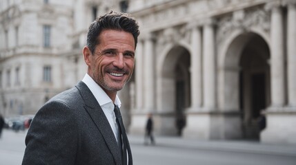 Confident professional man smiles in a tailored suit, exuding success and style. The building background adds a touch of urban elegance.