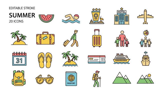 Aesthetic Summer Travel and Leisure Icons Set with Holiday Destinations, Activities, and Essential Items in a Contemporary Line Design
