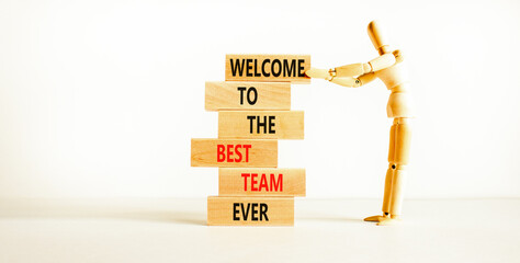 Welcome to best team symbol. Concept words Welcome to the best team ever on wooden block. Beautiful white table background. Businessman icon. Business motivational and welcome to best team concept.
