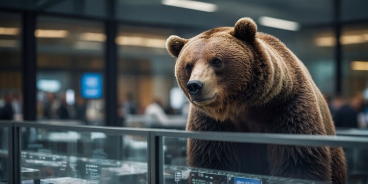 The high-definition image of a bear gazing out over a bustling trading floor captures themes of foresight and leadership, ideal for financial and corporate strategy visualizations.