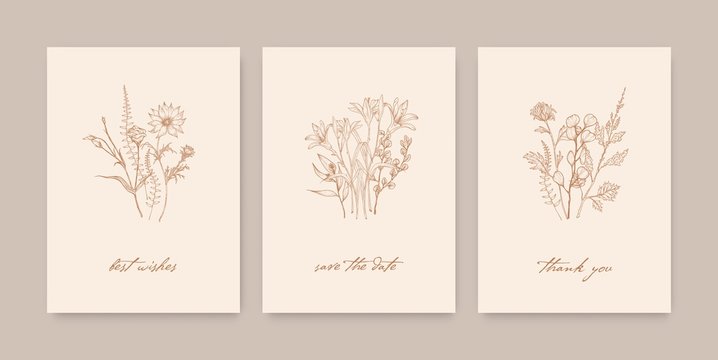 Bundle of elegant card templates decorated with wild blooming flowers, herbs and herbaceous plants on light background. Monochrome realistic hand drawn vector illustration in beautiful vintage style.