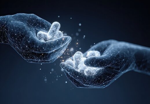 Futuristic digital hands transfer glowing capsules in abstract scientific setting