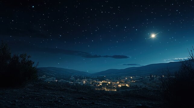 Star shining over Bethlehem village at night during Christmas