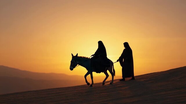 Silhouette of mary and joseph traveling on a donkey through the desert at sunset. Biblical scene representing the holy family's journey to bethlehem for the nativity story